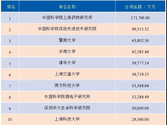 2019年高校院所以转让、许可、作价投资3种方式转化科技成果合同金额前10名