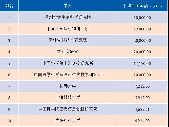 2019年高校院所以转让、许可、作价投资方式转化科技成果的平均合同金额排名前10名