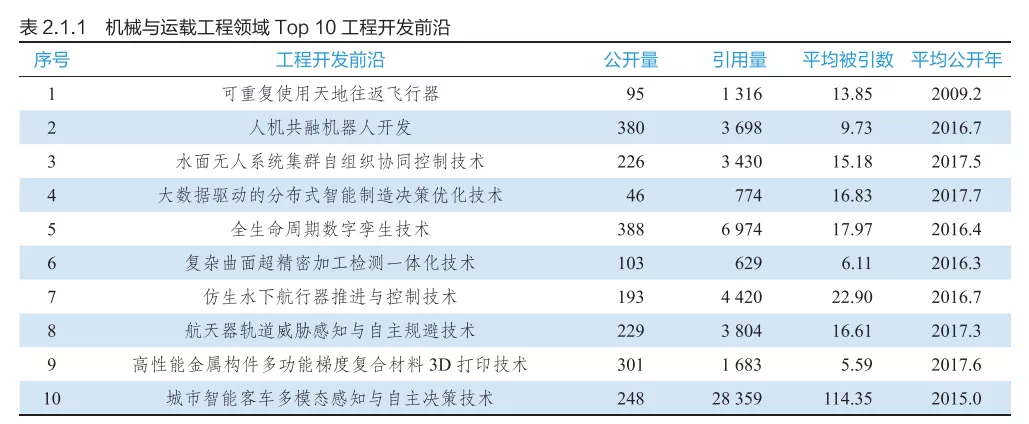机械与运载工程领域Top 10工程研究热点涉及机械工程、船舶与海洋工程、航空宇航科学技术、兵器科学与技术、动力及电气设备工程与技术、交通运输工程等学科方向。